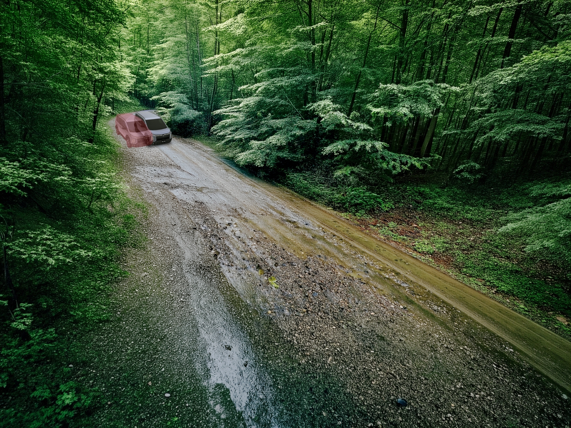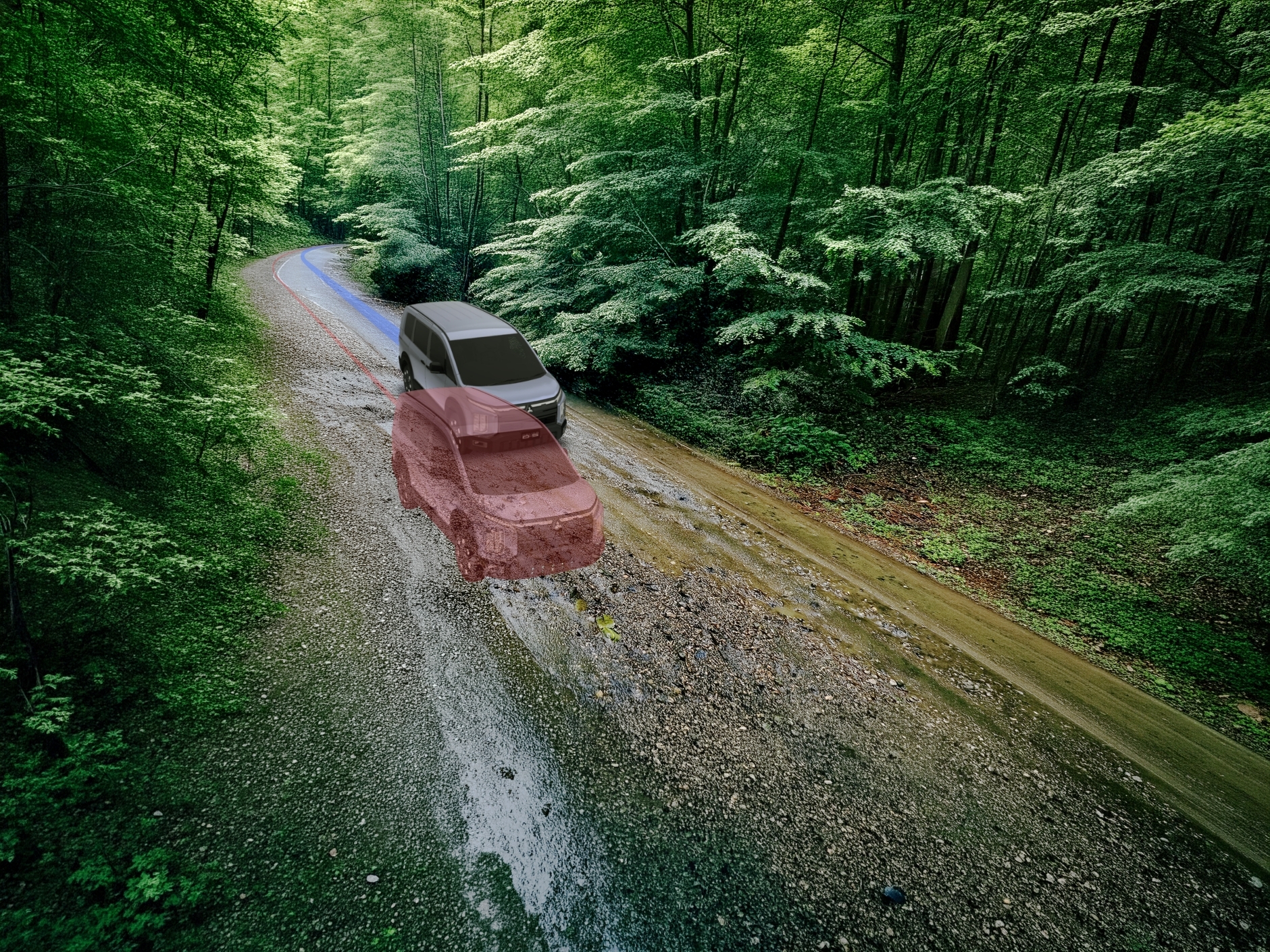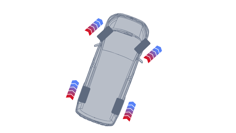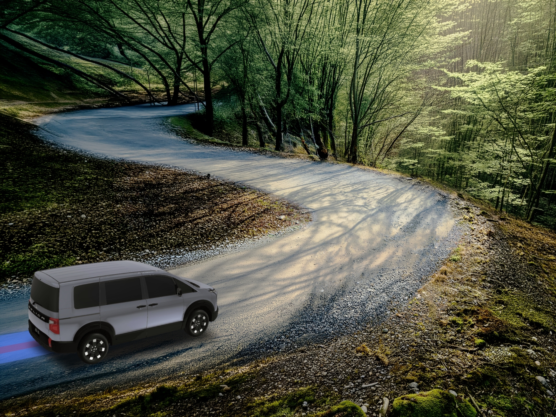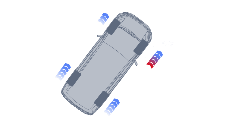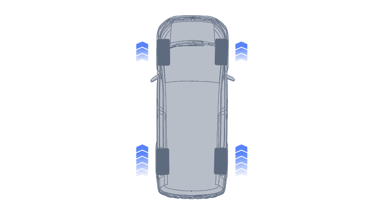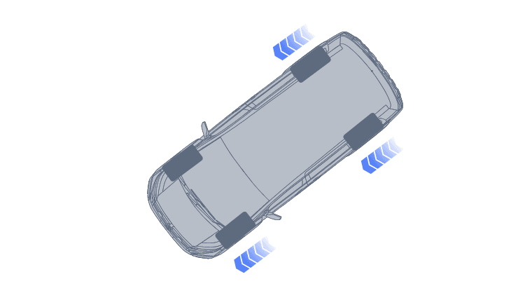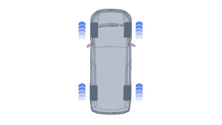 砂利道において、タイヤを完全にロックさせると制動距離が伸びる傾向にあります。そこでABSが断続的なブレーキ制御を行い、グリップを確保しながらステアリングの応答性を維持。同時に, 四輪すべてにエンジンブレーキを最適に配分することで、フットブレーキへの過度な依存を抑え、安定した減速を実現します。