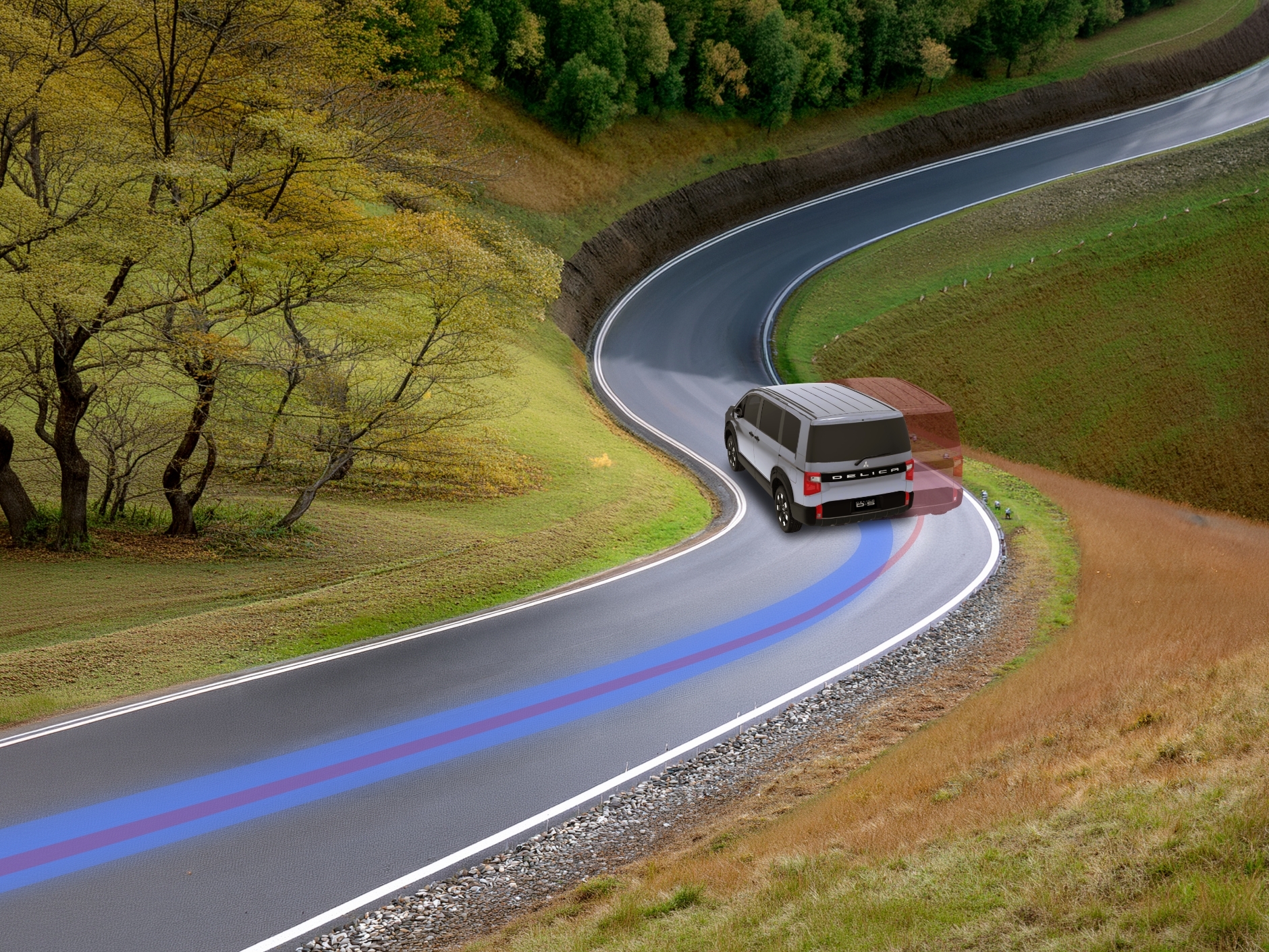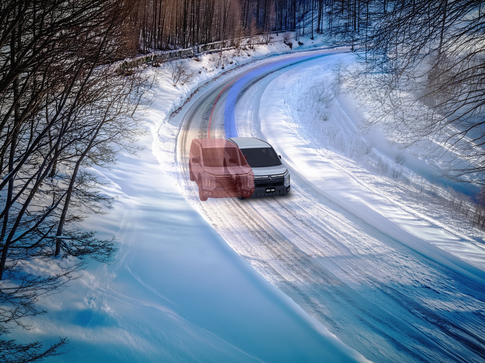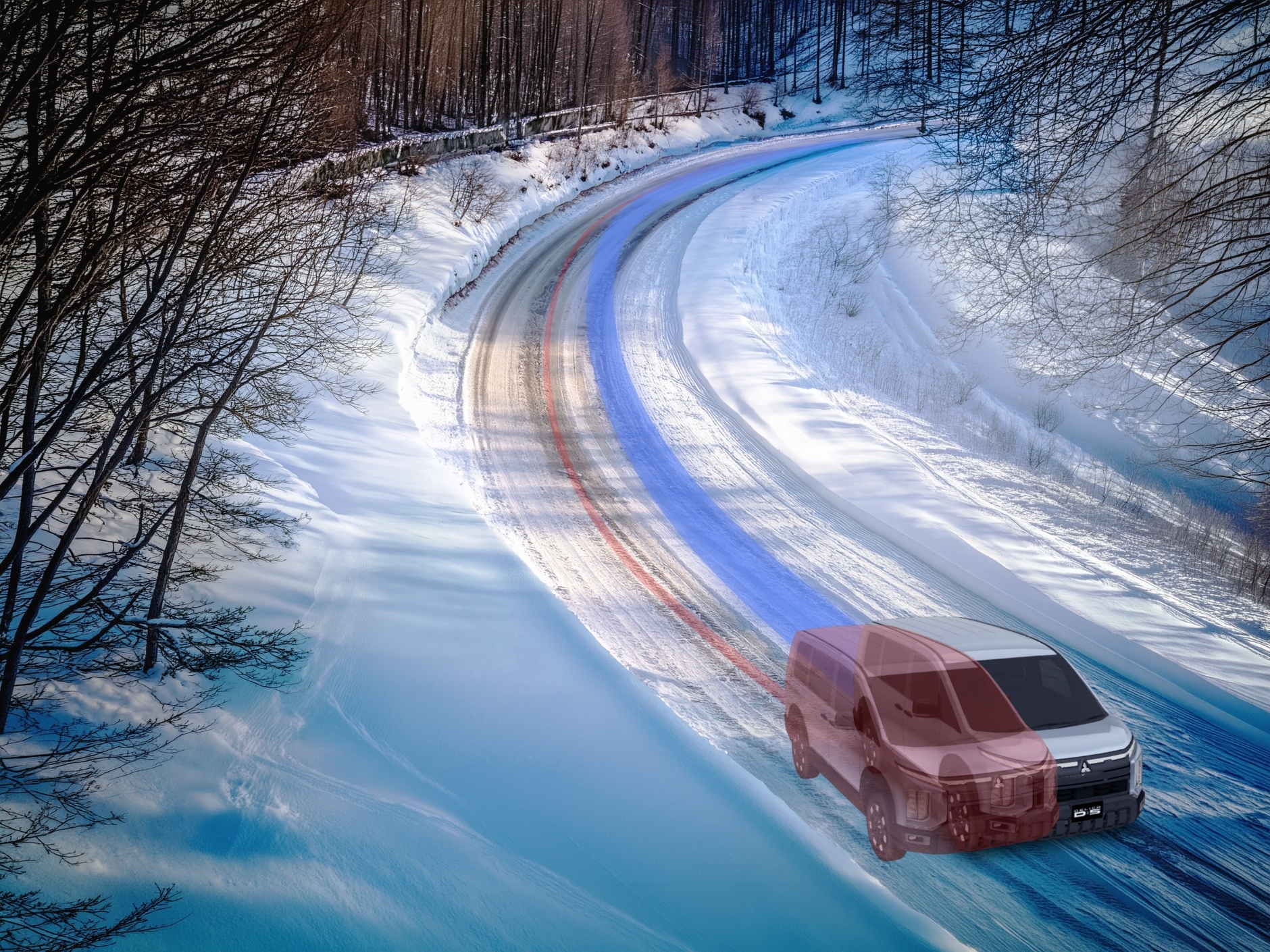 雪が積もってるカーブも、デリカなら安心なんだよね。車体の左右のバランスを整えて膨らみを抑えてくれるから、こんな雪道でも安全に曲がれるんだ。