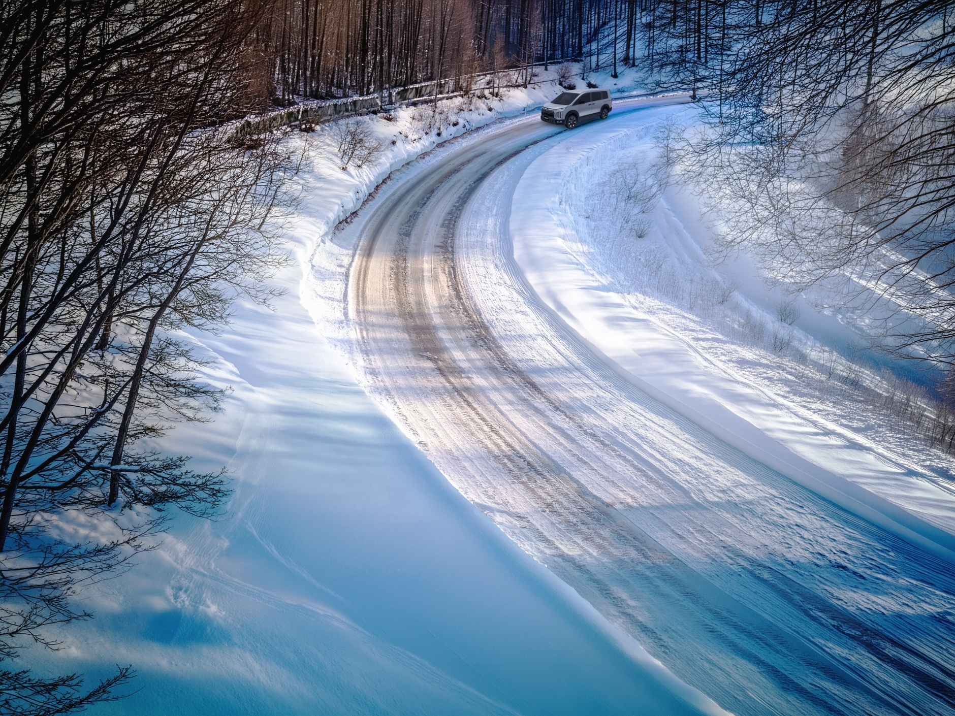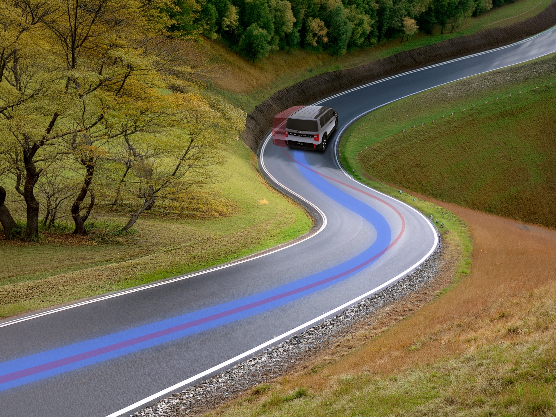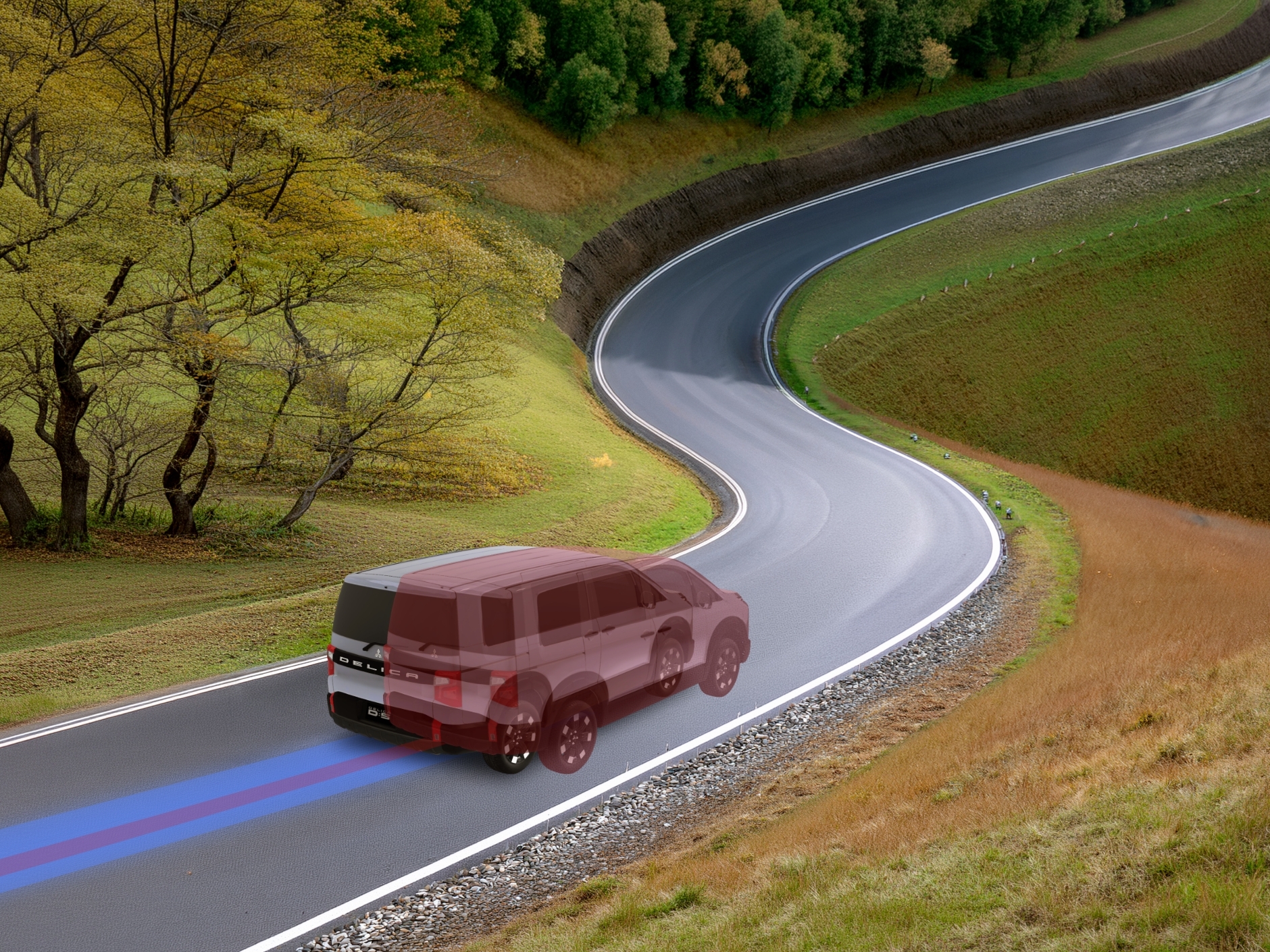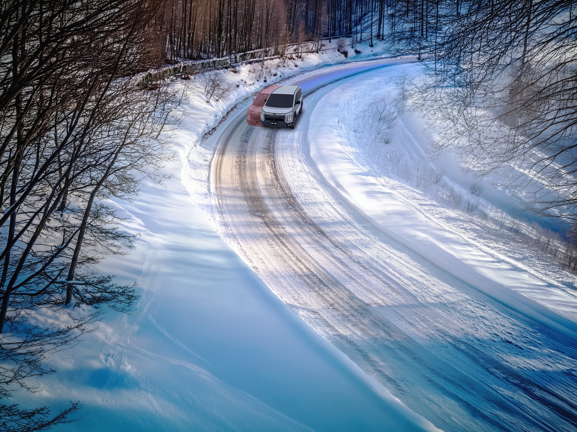 雪が積もってるカーブも、デリカなら安心なんだよね。車体の左右のバランスを整えて膨らみを抑えてくれるから、こんな雪道でも安全に曲がれるんだ。
