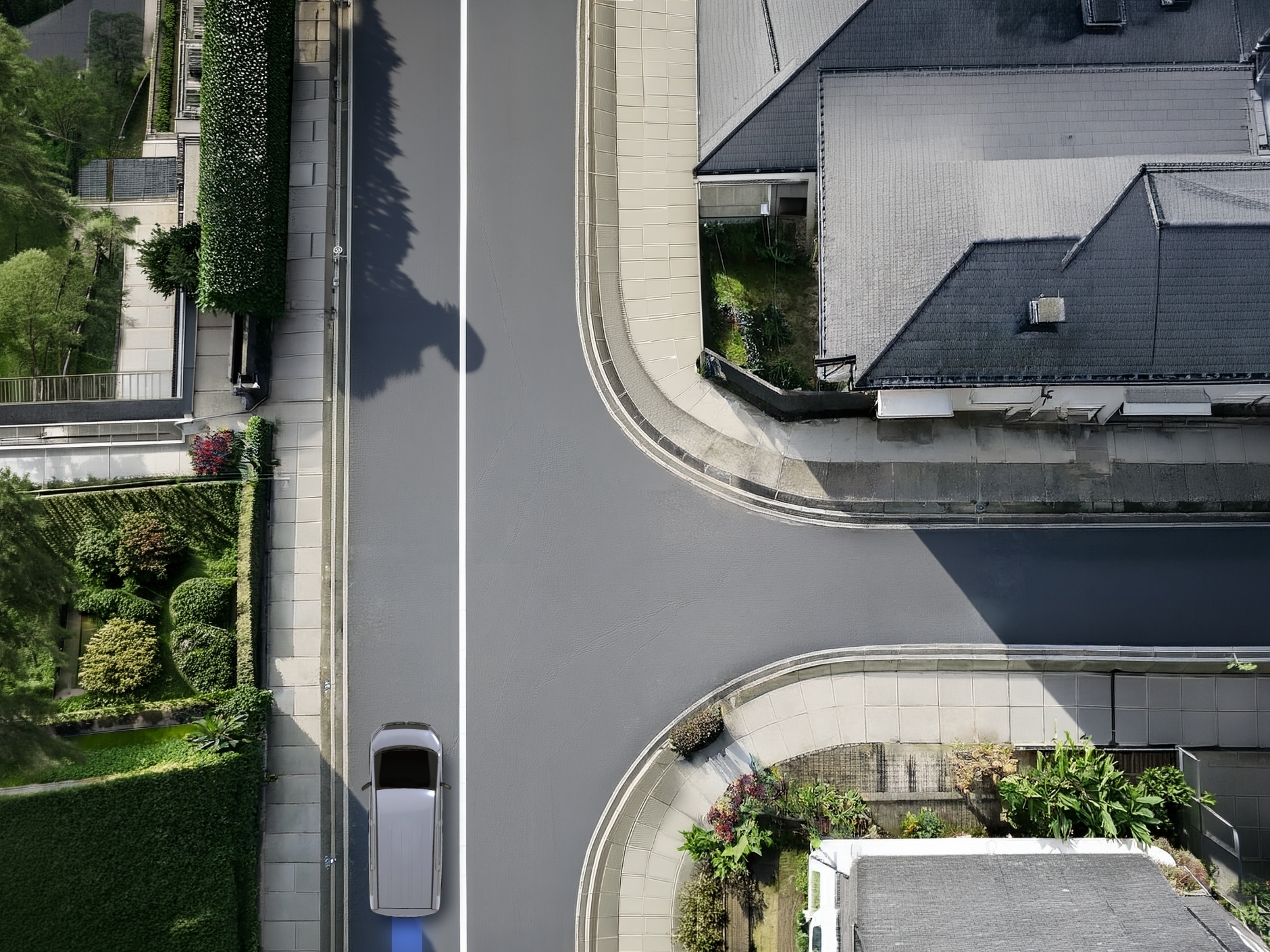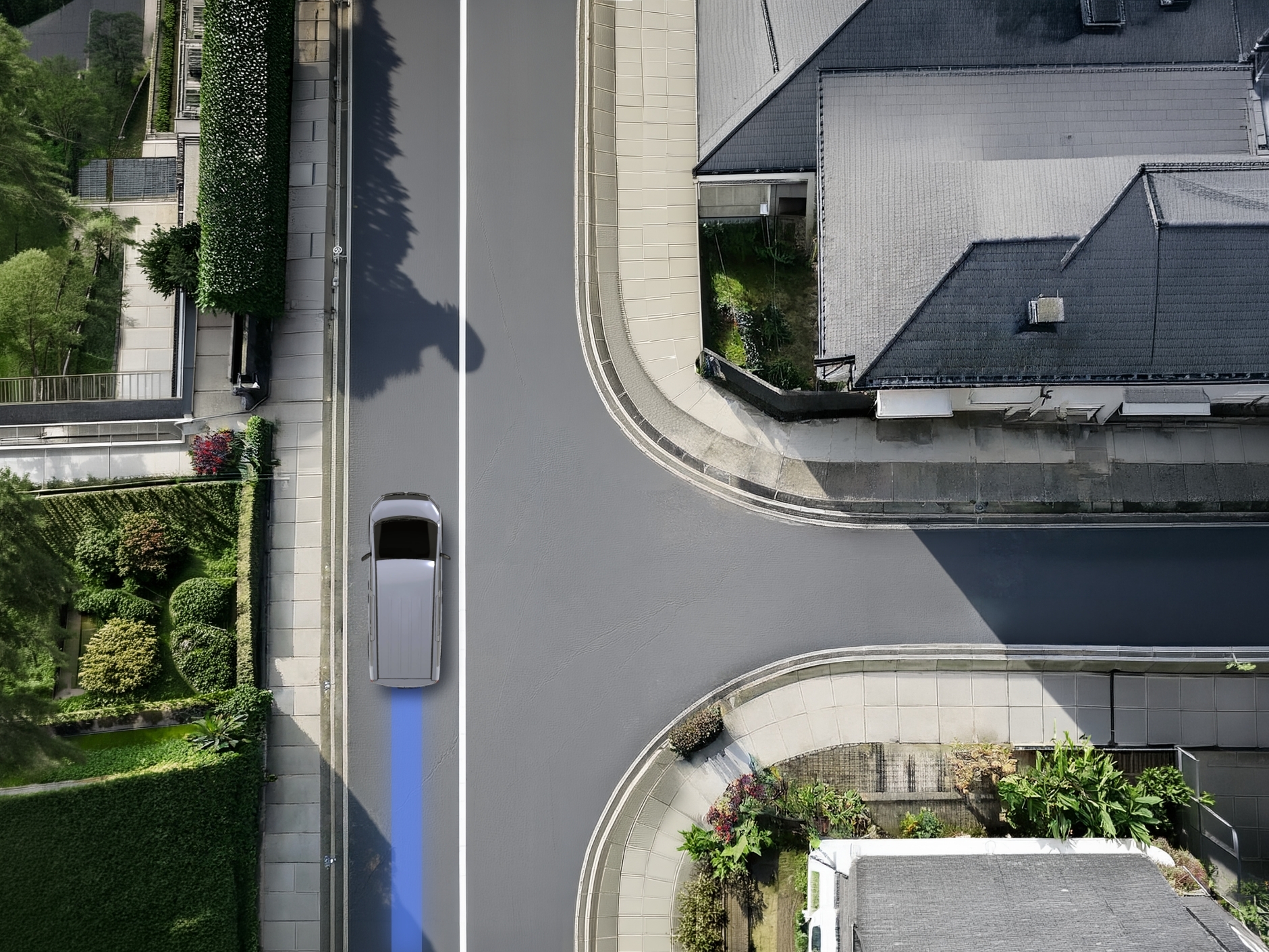 デリカって、オフロード以外にも、こういう住宅街の細い道や交差点も得意なんだね!