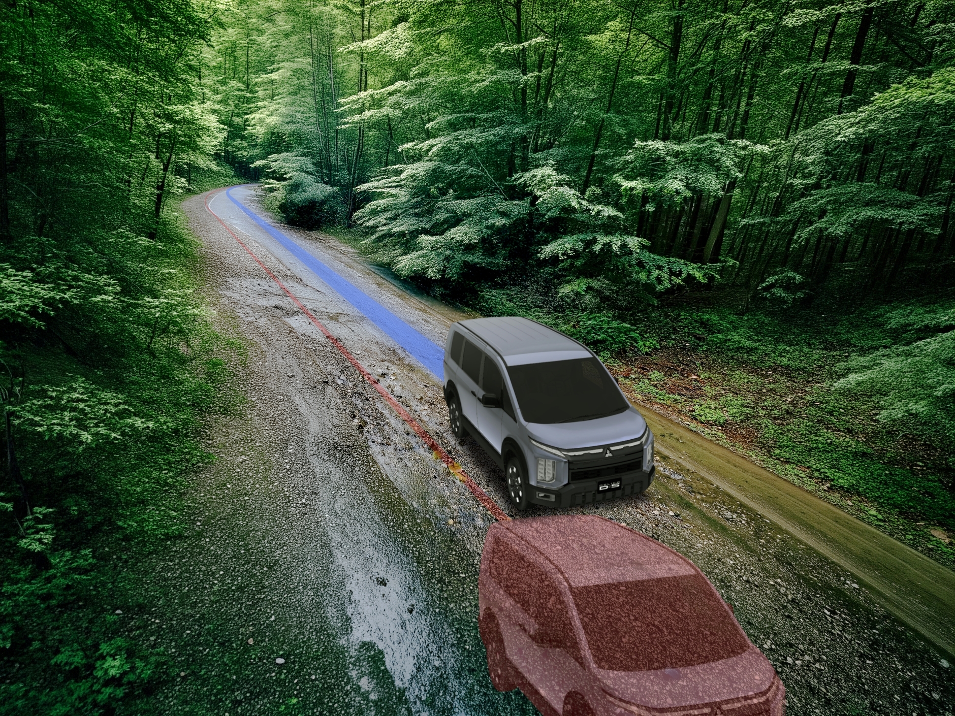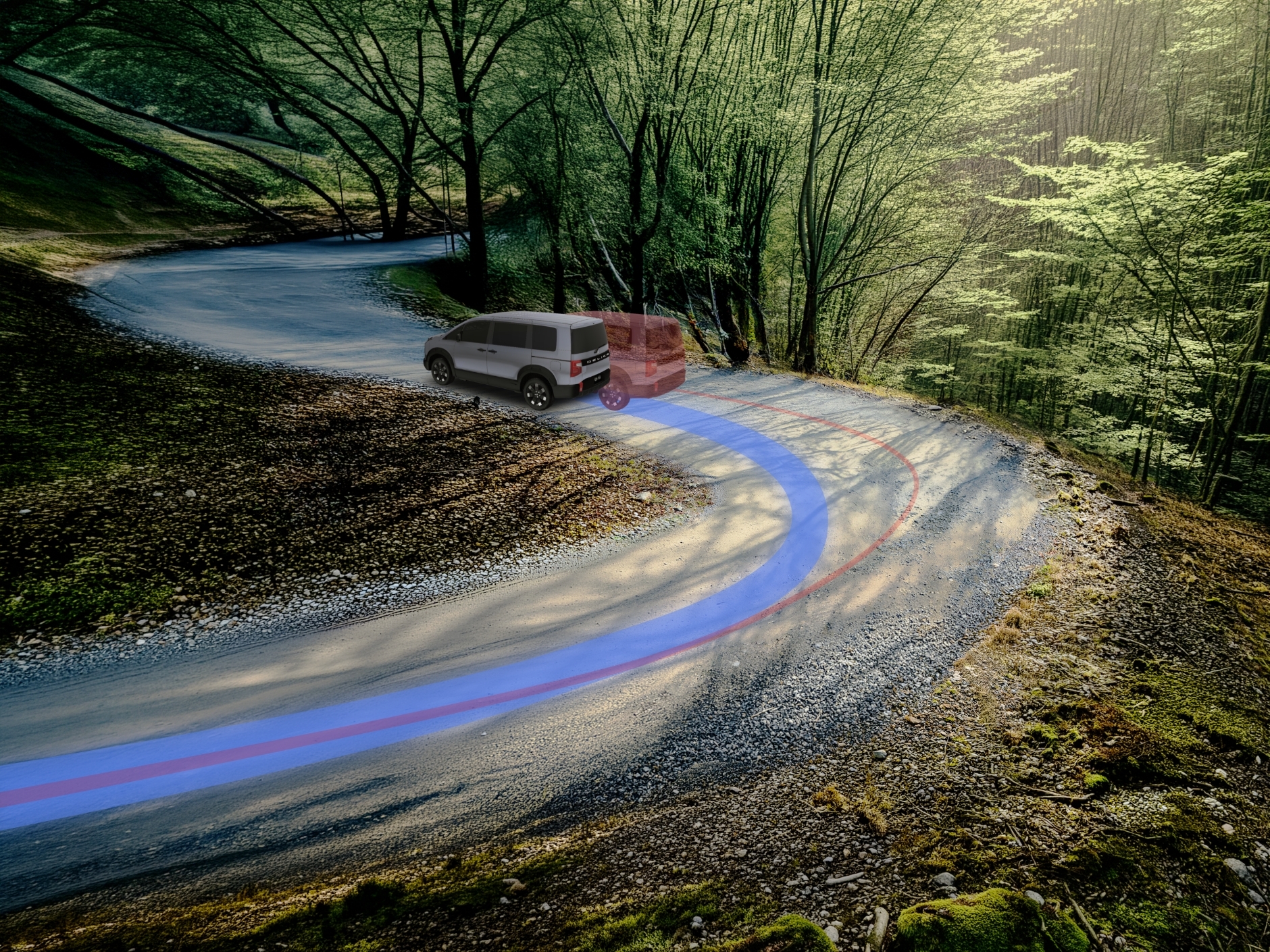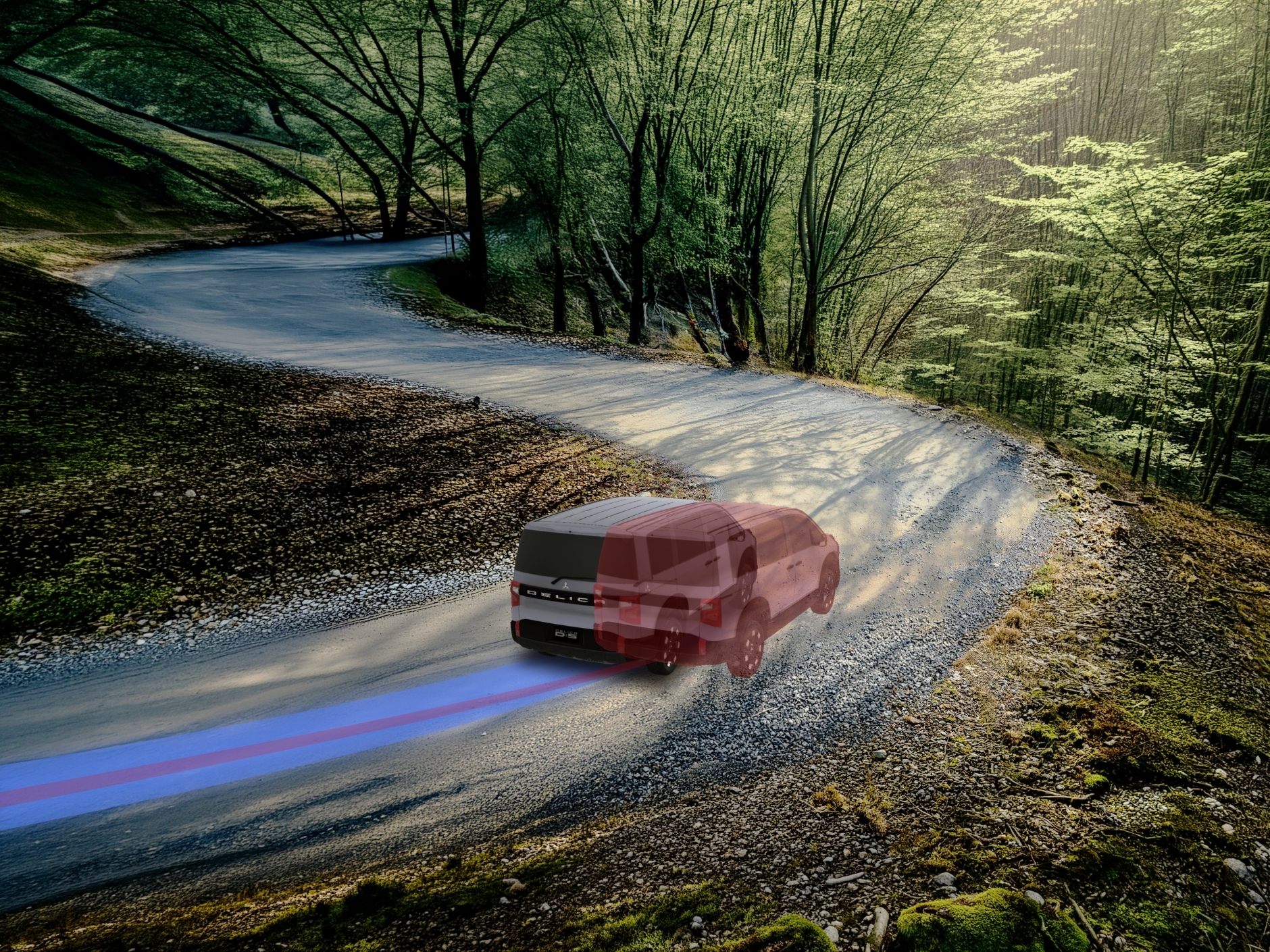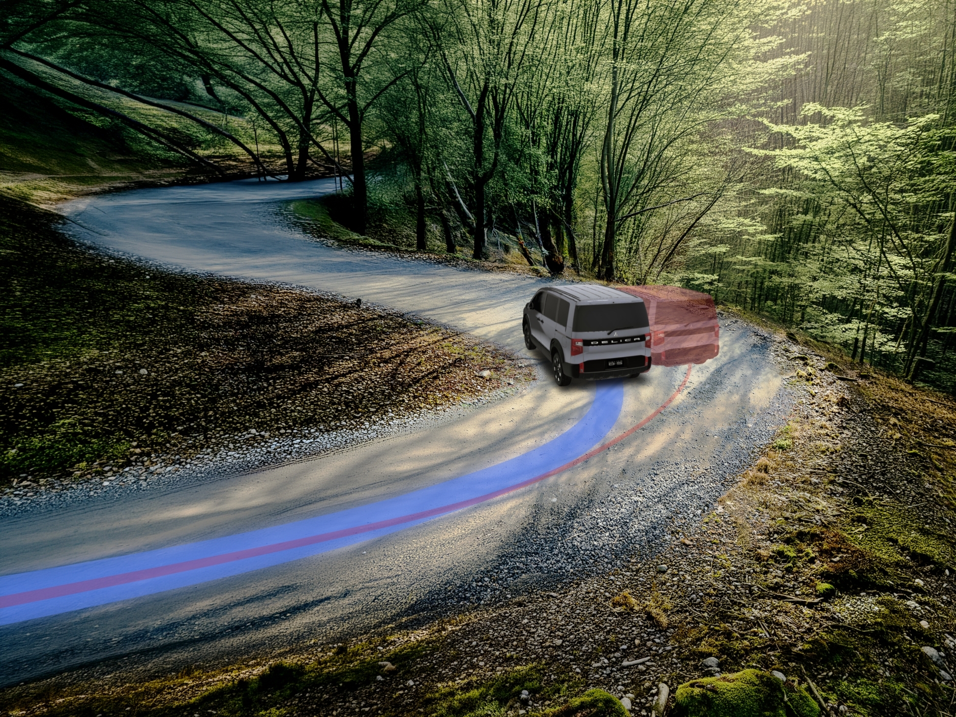 デリカなら細かい砂利道だって滑らないし、こんなカーブでもしっかり曲がるように4つのタイヤの回転数を調整してくれるの!もしも外側に滑りそうになっても、体勢を整えてくれるから大丈夫。