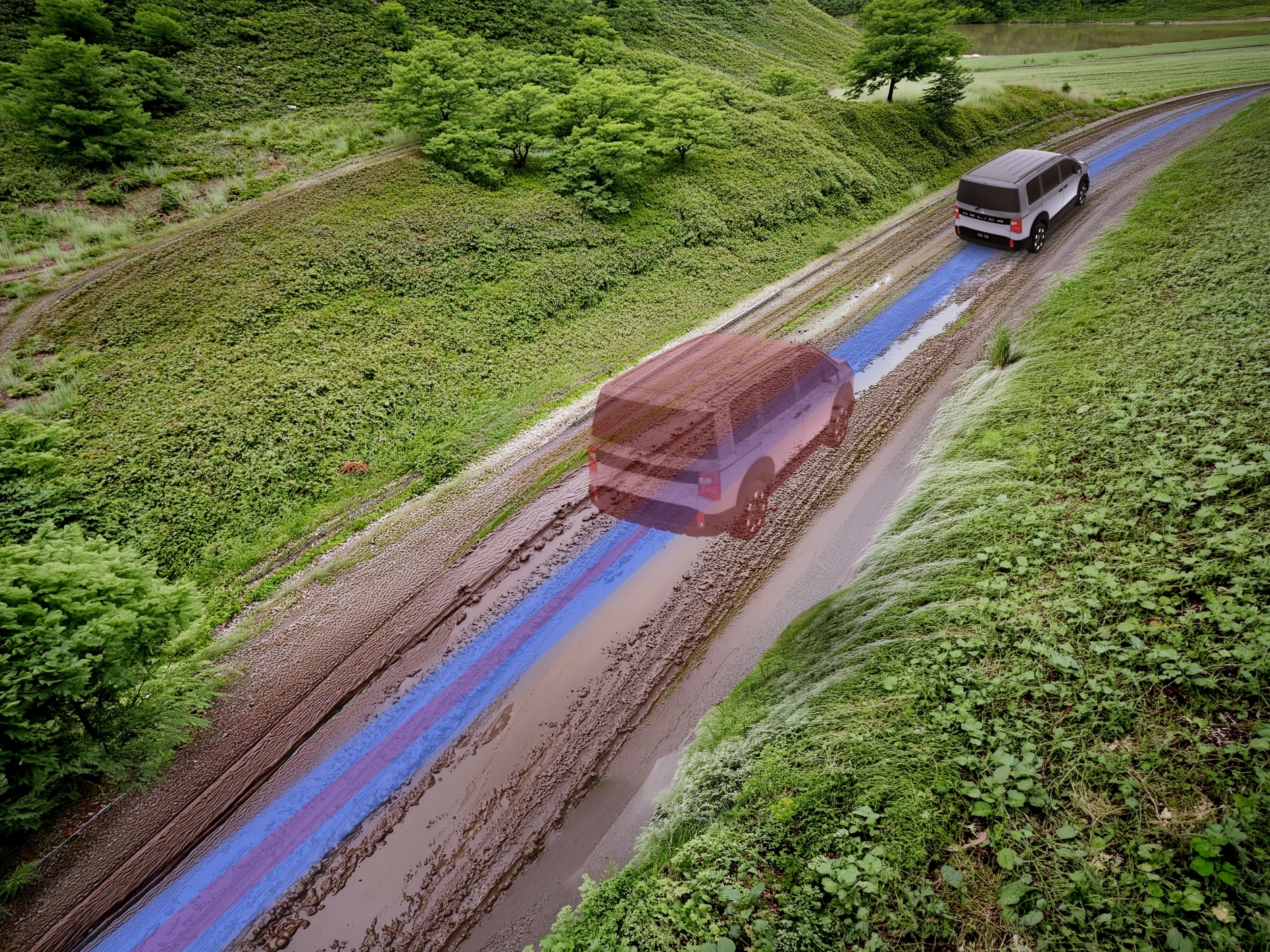 うん、平気だよ。デリカが水たまりに気がついてくれて、力加減を調整してくれてるみたい!おかげで、水たまりに突入してもフラつかずに真っ直ぐ進めるんだ。