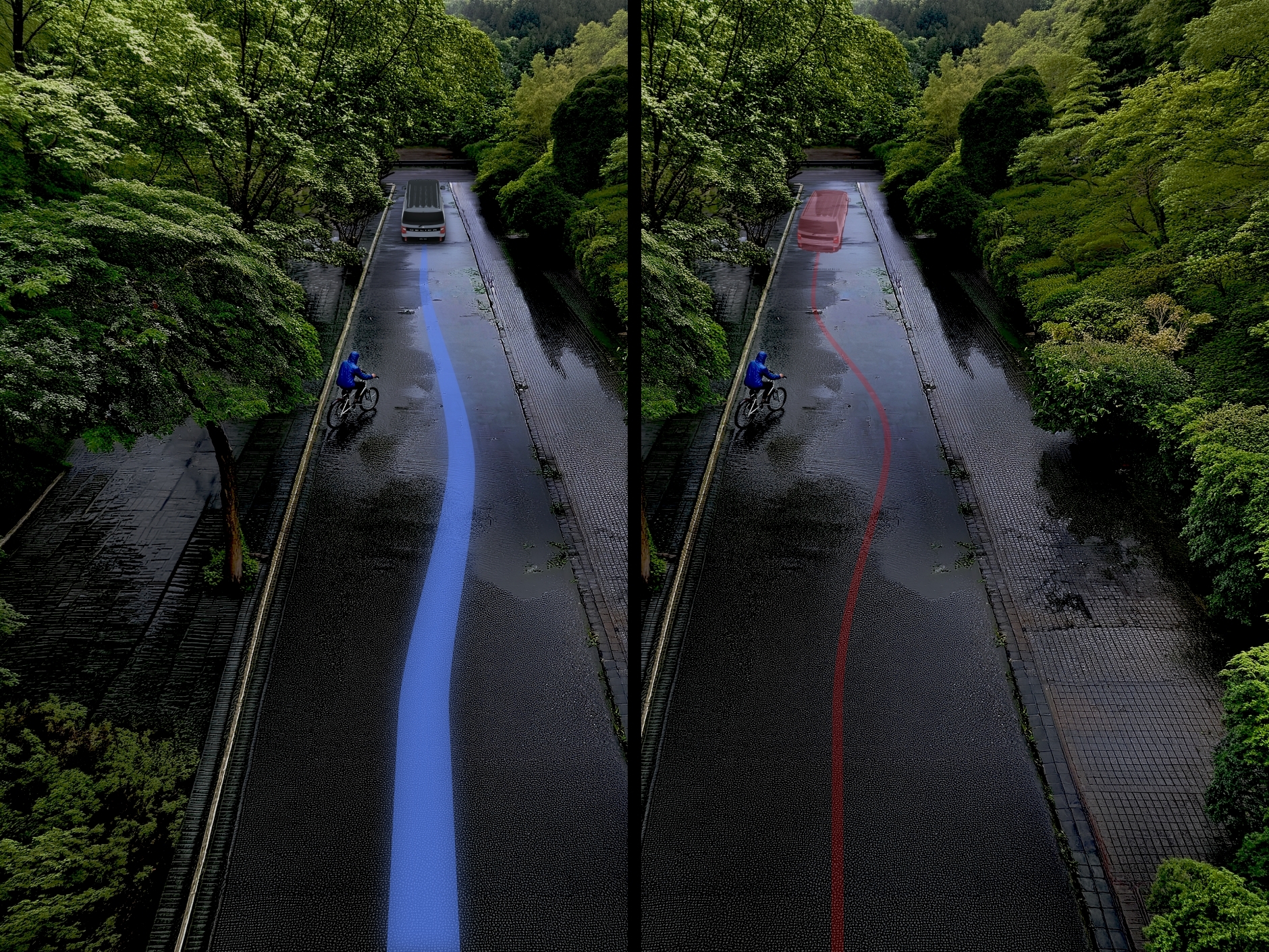 雨で視界が悪いね……。うわっ!自転車が飛び出してきた!危ない!