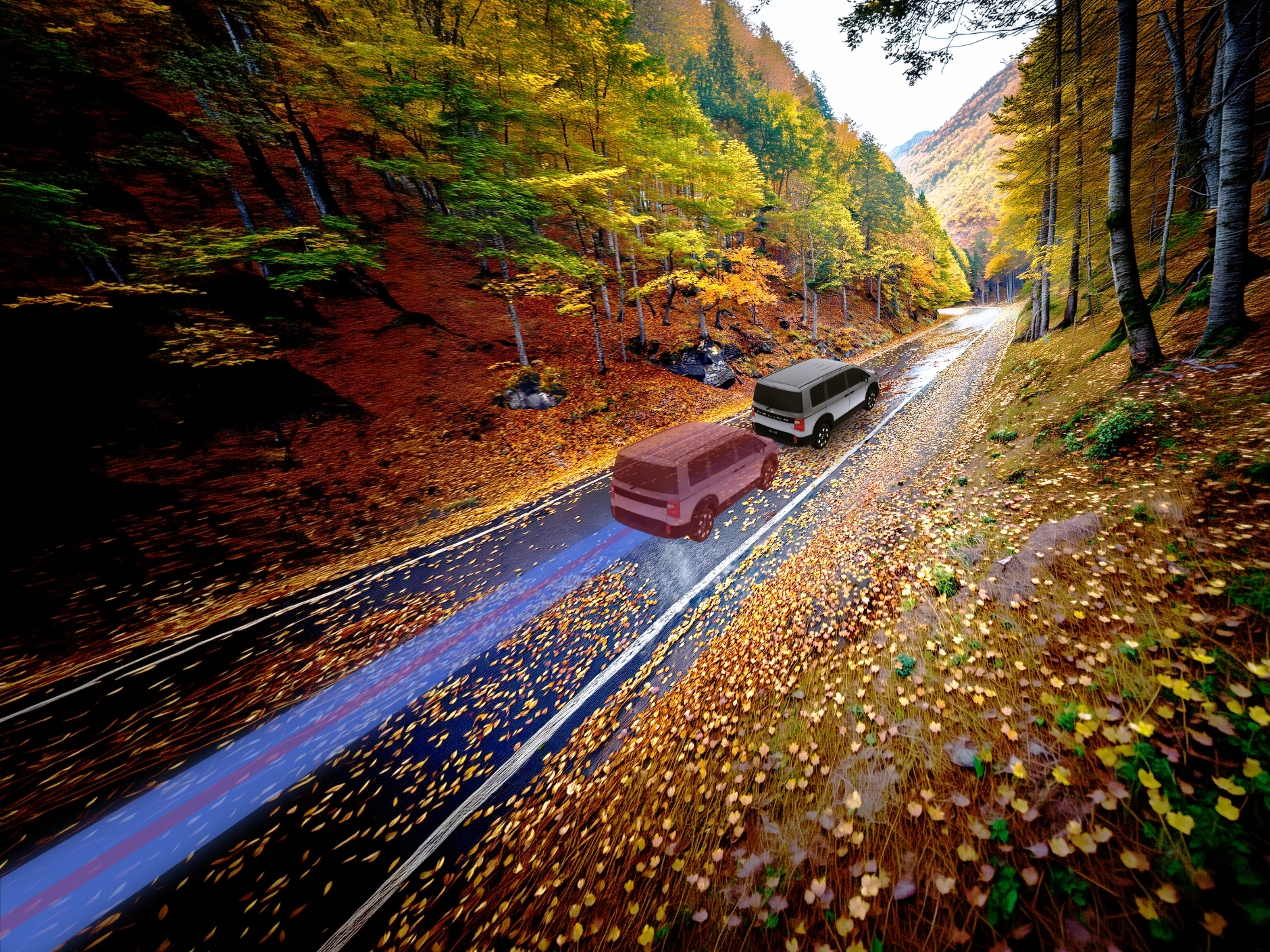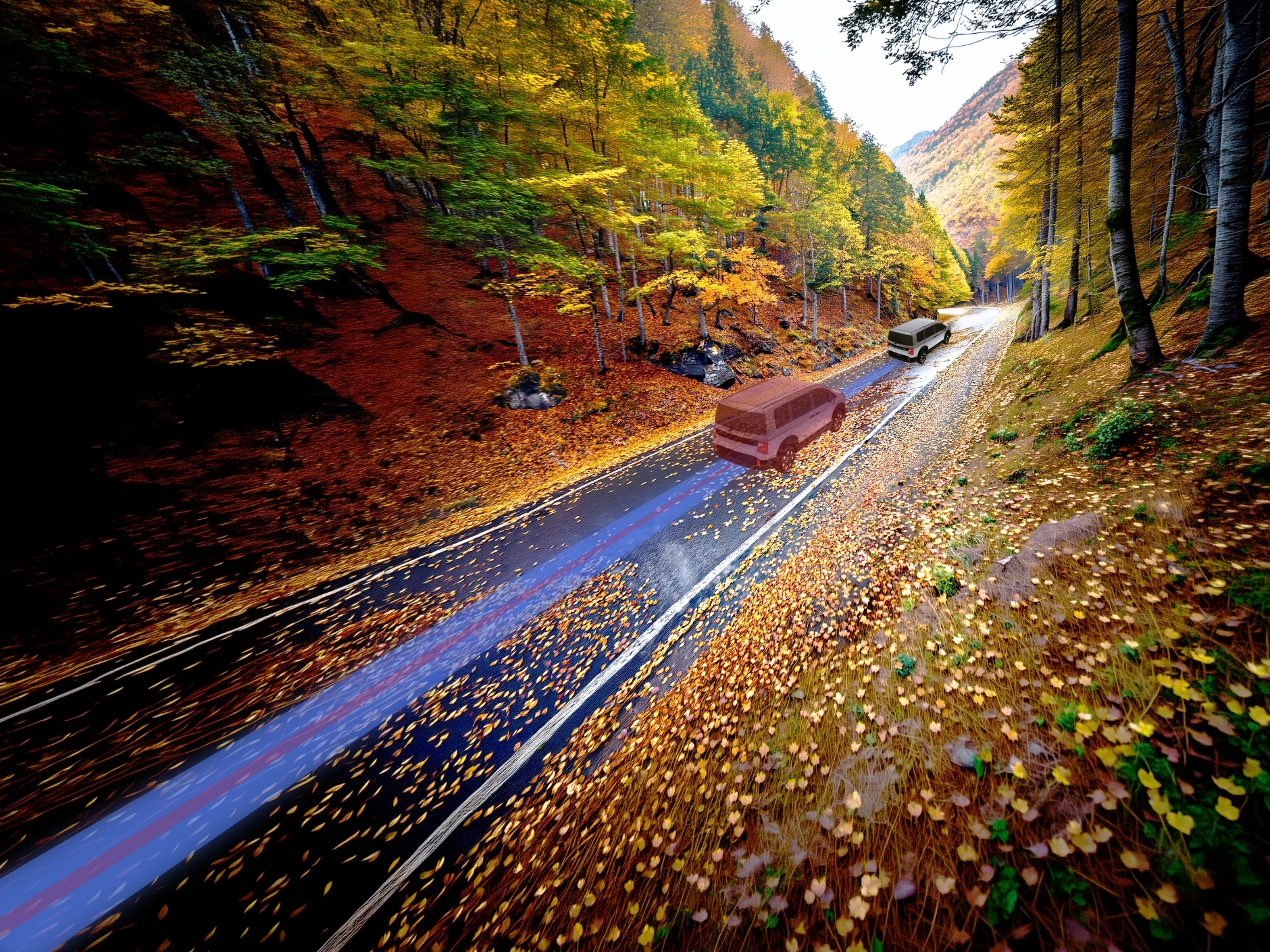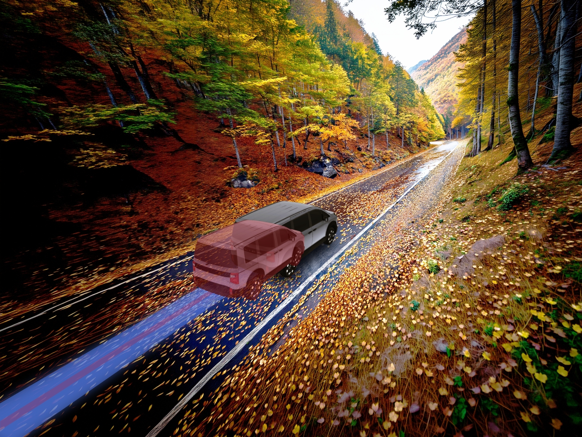 この時期の紅葉は綺麗だね!でも落ち葉でタイヤが滑らないように、気をつけてね。昨日の雨で少し濡れているようだし。