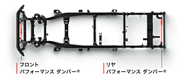 フロントはダブルウィッシュボーン式、リヤはリーフスプリング式を採用したサスペンションを熟成させ、優れた走行性能と快適性を実現。また新たに「パフォーマンス ダンパー®」を採用。専用にチューニングを施したパーツをラダーフレームの前後に装着することで、走行中に発生する車体のねじれや不快なノイズ・振動を効果的に吸収し、上質で快適な走りをもたらします。