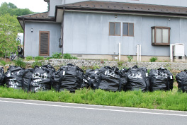 眼の前の道端に置かれた何袋ものビニール袋の中に放射性物質を含んだ土や葉っぱなどが詰め込まれている。
