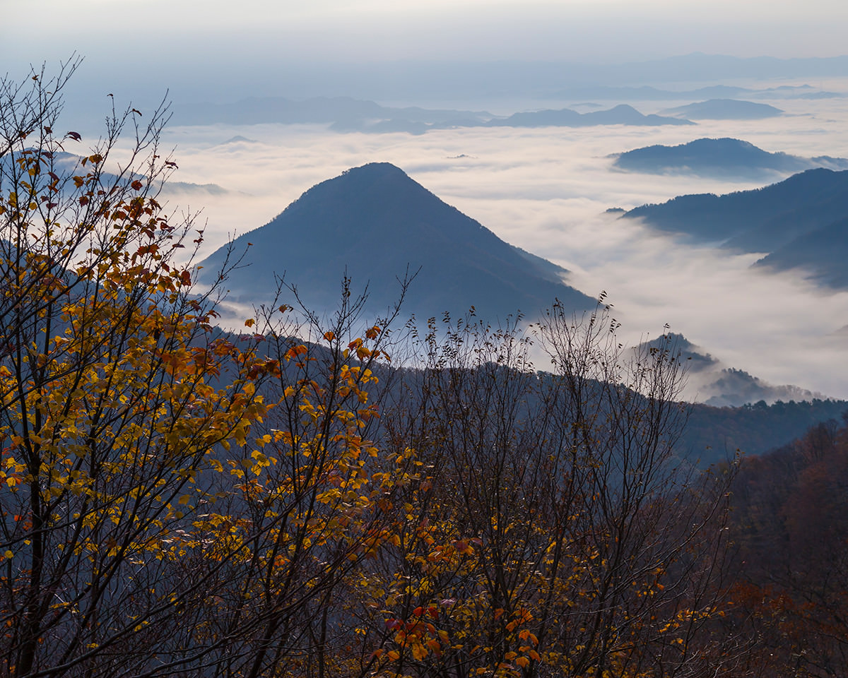 鬼の伝説が残る、標高832mの大江山。その八合目にある鬼嶽稲荷神社からは、視界の開ける由良川上空に広がる雲海を眺められ、秋には赤黄に染まる紅葉とのコラボレーションが期待できる。森の中に佇む神社の雰囲気も相まって、周囲の山々を包み込む姿はまさに神々しい。